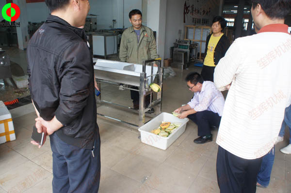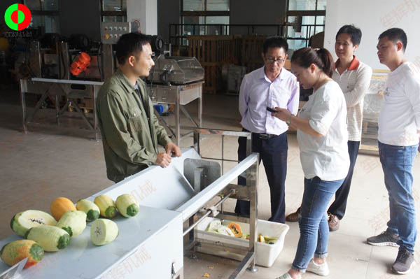客戶親臨我司測試木瓜削皮、瓜果切丁及蔬果分瓣等加工處理設備!笙輝機械專注于肉類、水產、果蔬類等食品前處理加工機械的研發生產、制造,滿足客戶各類中*央廚房生產線非標工程定制實施!...